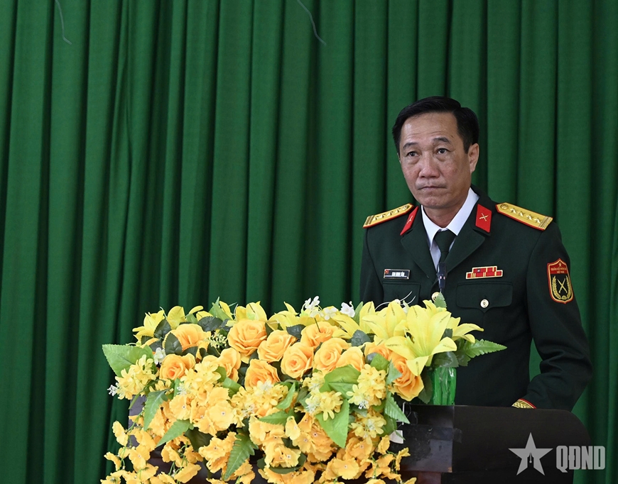 | Đại tá Cao Minh Tâm, Phó chính ủy Bộ CHQS tỉnh An Giang phát biểu tại buổi lễ. |