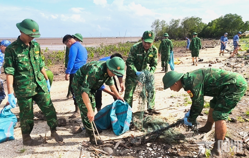 | Cán bộ, chiến sĩ Bộ đội Biên phòng tỉnh Cà Mau thu gom rác thải ven biển, tổ chức trồng rừng, góp phần bảo vệ môi trường. |