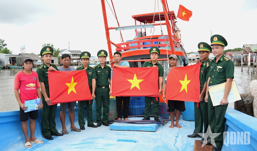 | Đồn Biên phòng Đất Mũi trao cờ Tổ quốc tặng ngư dân an tâm vươn khơi bám biển. |
