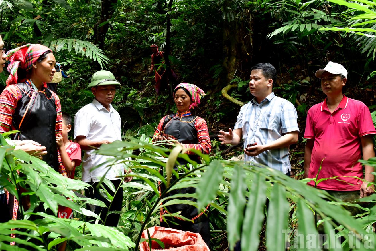 Chủ tịch UBND xã Thu Lũm, ông Lê Thanh Tâm (thứ 2, bên phải) tuyên truyền, hướng dẫn người dân áp dụng kỹ thuật trồng trọt mới trong sản xuất nông – lâm kết hợp. Ảnh: Bùi Bình