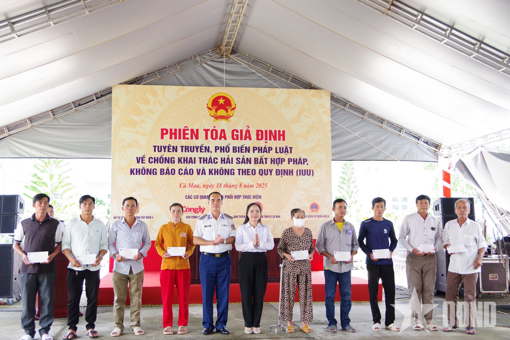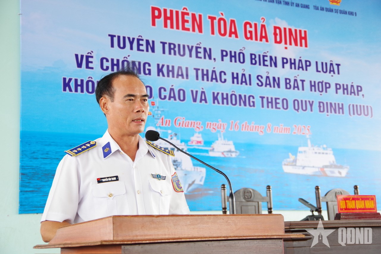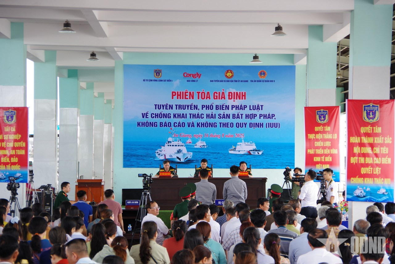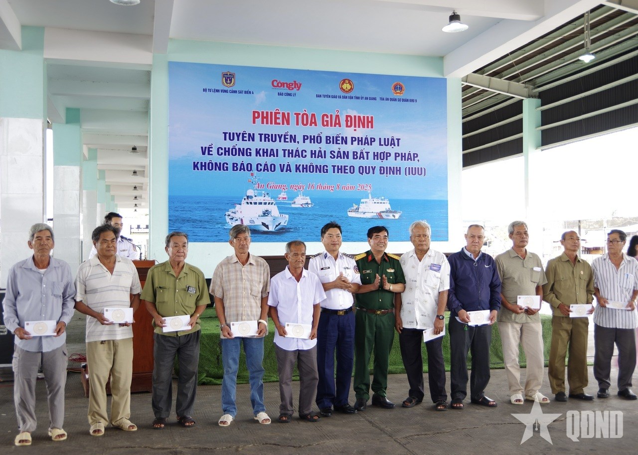 Trong hai ngày 16 và 18-8, Bộ tư lệnh Vùng Cảnh sát biển 4 phối hợp với Báo Công lý và Tòa án quân sự Quân khu 9 tổ chức tuyên truyền pháp luật về chống khai thác thủy sản bất hợp pháp, không báo cáo, không theo quy định (IUU) bằng hình thức “Phiên tòa giả định” xét xử sơ thẩm vụ án hình sự về tội “tổ chức cho người khác xuất cảnh trái phép” theo quy định tại khoản 3, Điều 348 của Bộ luật Hình sự.