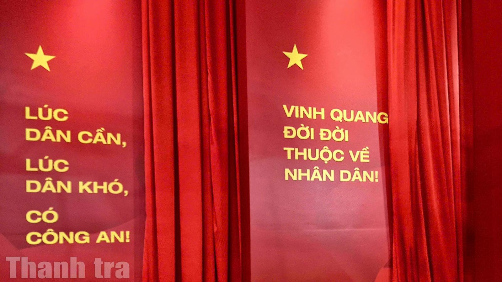 Một khẩu hiệu treo tại khu trưng bày triển lãm thành tựu 80 năm Công an Nhân dân. Ảnh: Thái Minh
