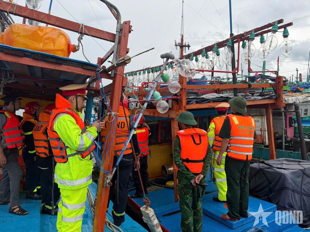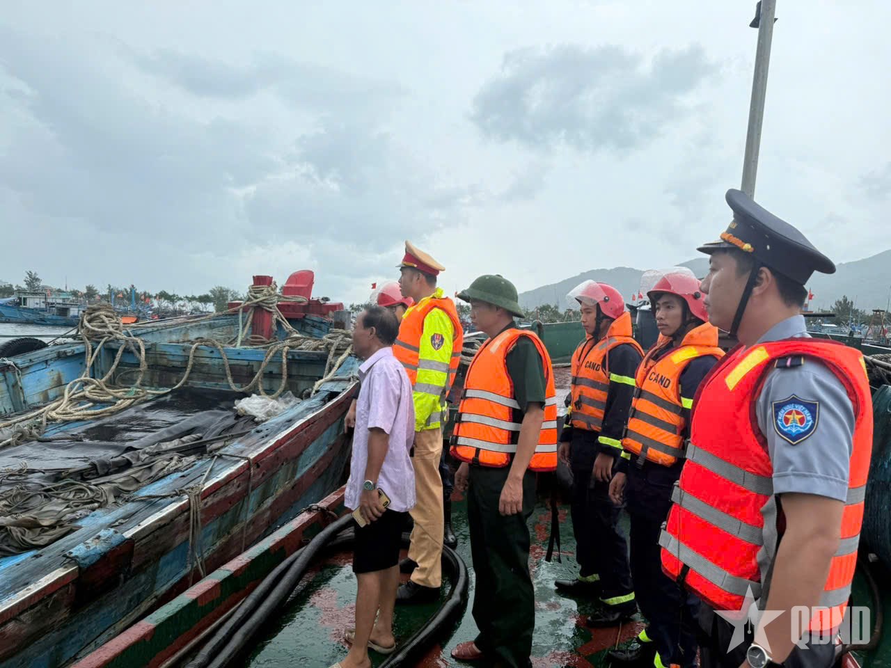 Đồn Biên phòng Sơn Trà phối hợp với Đội Cảnh sát phòng cháy, chữa cháy đường sông tuyên truyền, hướng dẫn, kiểm tra ngư dân, chủ doanh nghiệp neo đậu tàu cá tránh bão. |