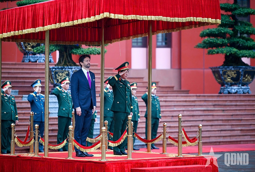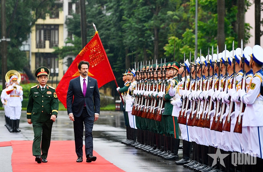 | Đại tướng Phan Văn Giang và Phó thủ tướng, Bộ trưởng Bộ Quốc phòng Slovakia Robert Kalinak duyệt Đội danh dự Quân đội nhân dân Việt Nam. Ảnh: TUẤN HUY |