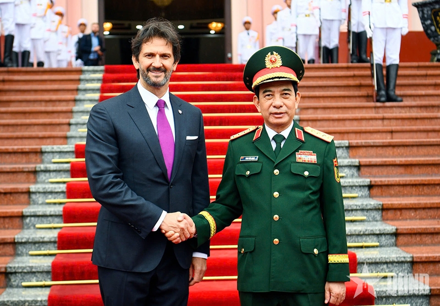 Đại tướng Phan Văn Giang đón Phó thủ tướng, Bộ trưởng Bộ Quốc phòng Slovakia Robert Kalinak. Ảnh: TUẤN HUY |
