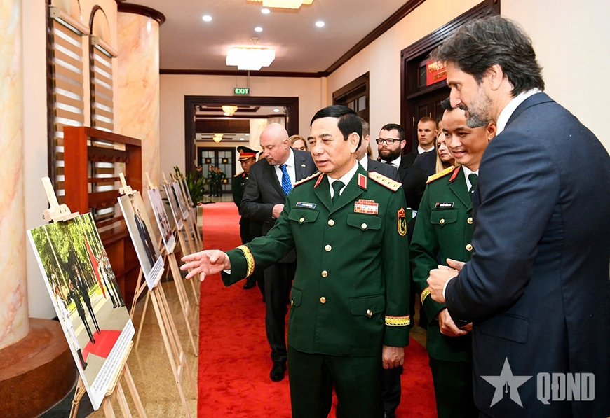 | Đại tướng Phan Văn Giang và Phó thủ tướng, Bộ trưởng Bộ Quốc phòng Slovakia Robert Kalinak tham quan trưng bày ảnh về quan hệ hợp tác giữa hai nước. Ảnh: TUẤN HUY |