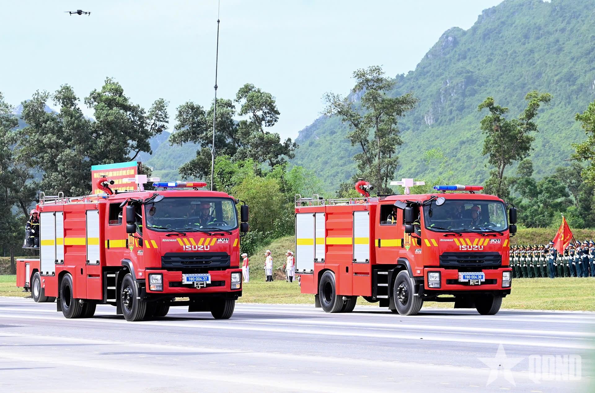 | Dàn xe phòng cháy, chữa cháy, cứu nạn, cứu hộ là phương tiện nhỏ gọn, cơ động cao, trang bị hệ thống liên lạc và chỉ huy, điều hành tại hiện trường; tiếp theo là xe chữa cháy tiêu chuẩn, được bố trí téc nước 4.000 lít, téc bọt 200 lít, máy bơm công suất lớn, có khả năng phun, hút nước linh hoạt; cuối cùng là xe thang hiện đại, có khả năng vươn cao đến 32m, xoay 360 độ, hỗ trợ chữa cháy, cứu người tại các tòa nhà cao tầng. Khối xe thể hiện sức mạnh chiến đấu, kỹ thuật, cơ động cao của lực lượng Cảnh sát Phòng cháy, chữa cháy và cứu nạn, cứu hộ, sẵn sàng ứng phó mọi tình huống khẩn cấp. |