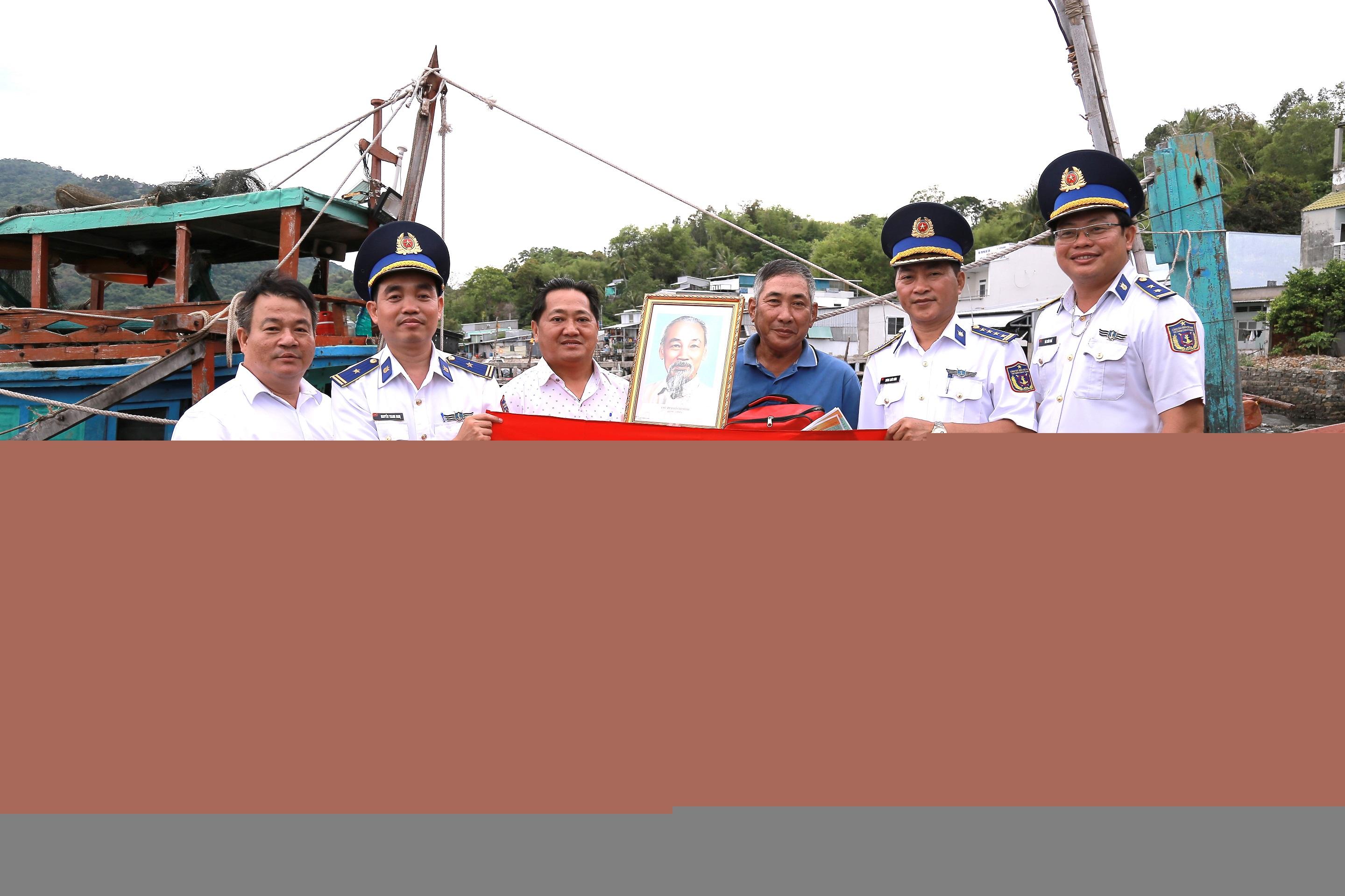 Cán bộ Bộ Tư lệnh Vùng Cảnh sát biển 4 và đại diện lãnh đạo địa phương tặng cờ Tổ quốc, ảnh Bác Hồ và túi thuốc y tế cho bà con ngư dân. Ảnh: A.X