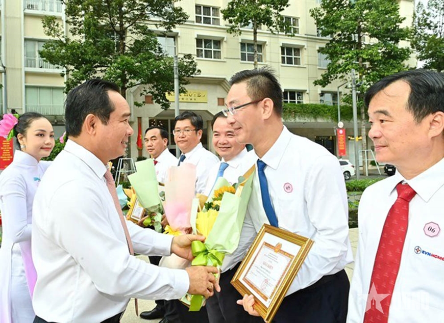 Lãnh đạo TP Hồ Chí Minh tặng hoa tuyên dương các điển hình “Dân vận khéo”. |