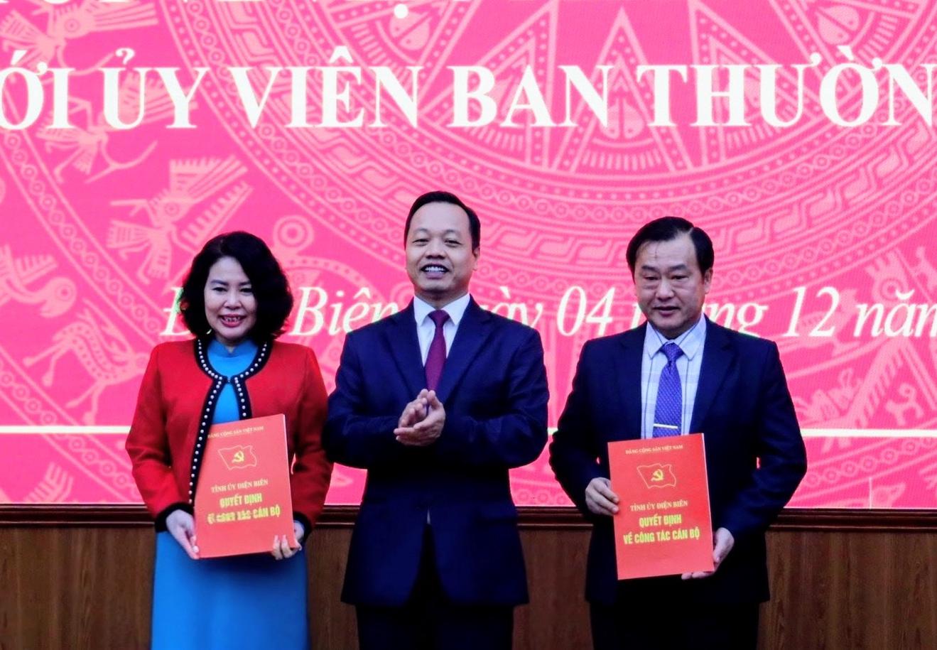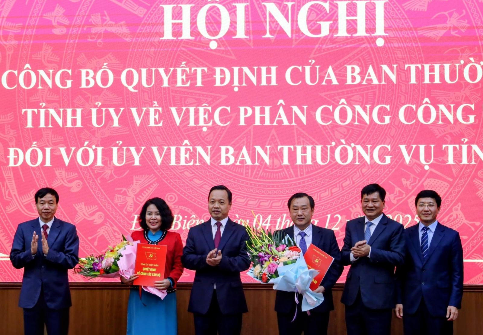 Các đồng chí Thường trực Tỉnh ủy Điện Biên tặng hoa chúc mừng hai đồng chí vừa được bổ nhiệm. Ảnh: Ngọc Thuỷ