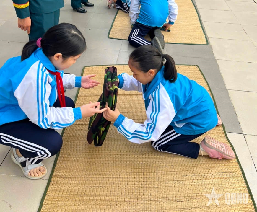 Điểm nhấn của chương trình là phần thi gấp chăn nội vụ, một nội dung quen thuộc trong sinh hoạt quân đội. Hoạt động diễn ra sôi nổi, giúp học sinh được trải nghiệm nếp sống kỷ luật, ngăn nắp, rèn luyện sự khéo léo và tinh thần tập thể. Bên cạnh đó, các em học sinh còn thể hiện tình cảm, lòng biết ơn qua những vần thơ, câu chuyện, tiết mục văn nghệ; đồng thời trình bày ý tưởng xây dựng “trường học xanh”, góp phần nâng cao ý thức bảo vệ môi trường.