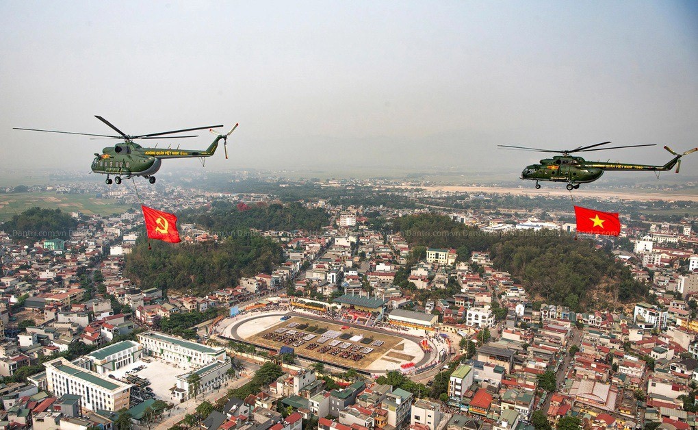 Kế đến là phần trình diễn của 9 máy bay trực thăng mang cờ Đảng, cờ Tổ quốc bay qua Lễ đài. Sau đó là phần trình diễn của Khối diễu binh (4 khối Nghi trượng, 24 khối quân đội, dân quân tự vệ, công an) và khối diễu hành (9 khối cựu chiến binh, thanh niên xung phong, dân công hỏa tuyến, công nhân, nông dân, tri thức, thanh niên, phụ nữ, khối các dân tộc Tây Bắc).
