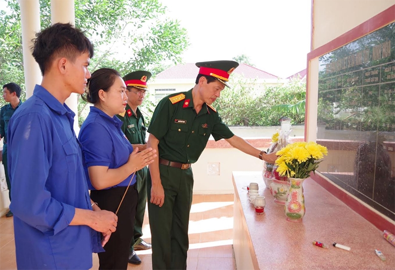 | Cán bộ, học viên Trường Sĩ quan Thông tin và đoàn viên, thanh niên địa phương dâng hương tại Đài tưởng niệm liệt sĩ Ninh Tây. |