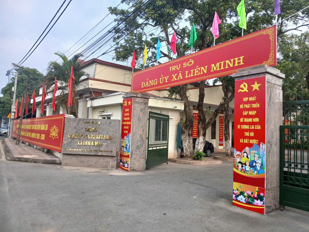 Cờ hoa, pano, khẩu hiệu rực rỡ chào mừng Đại hội đại biểu Đảng bộ xã Liên Minh. Ảnh: Minh Phú