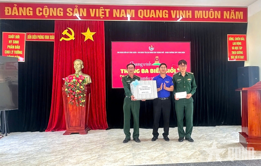 | Cán bộ Chi đoàn Tòa án nhân dân TP Huế tặng quà Chi đoàn Đồn Biên phòng Vinh Xuân. |