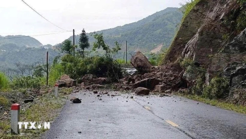 Taluy dương bị sạt, đất đá tràn xuống mặt đường tại Km 31 tỉnh lộ 177, đoạn qua thôn Tân Mình, xã Nậm Ty, huyện Hoàng Su Phì, gây tắc nghẽn giao thông toàn tuyến. (Ảnh: TTXVN phát)