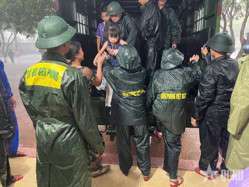 | Cán bộ, chiến sĩ Đồn Biên phòng Cửa khẩu cảng Cửa Lò-Bến Thủy, Ban Chỉ huy Bộ đội Biên phòng tỉnh Nghệ An hỗ trợ người dân sơ tán đến nơi an toàn. |