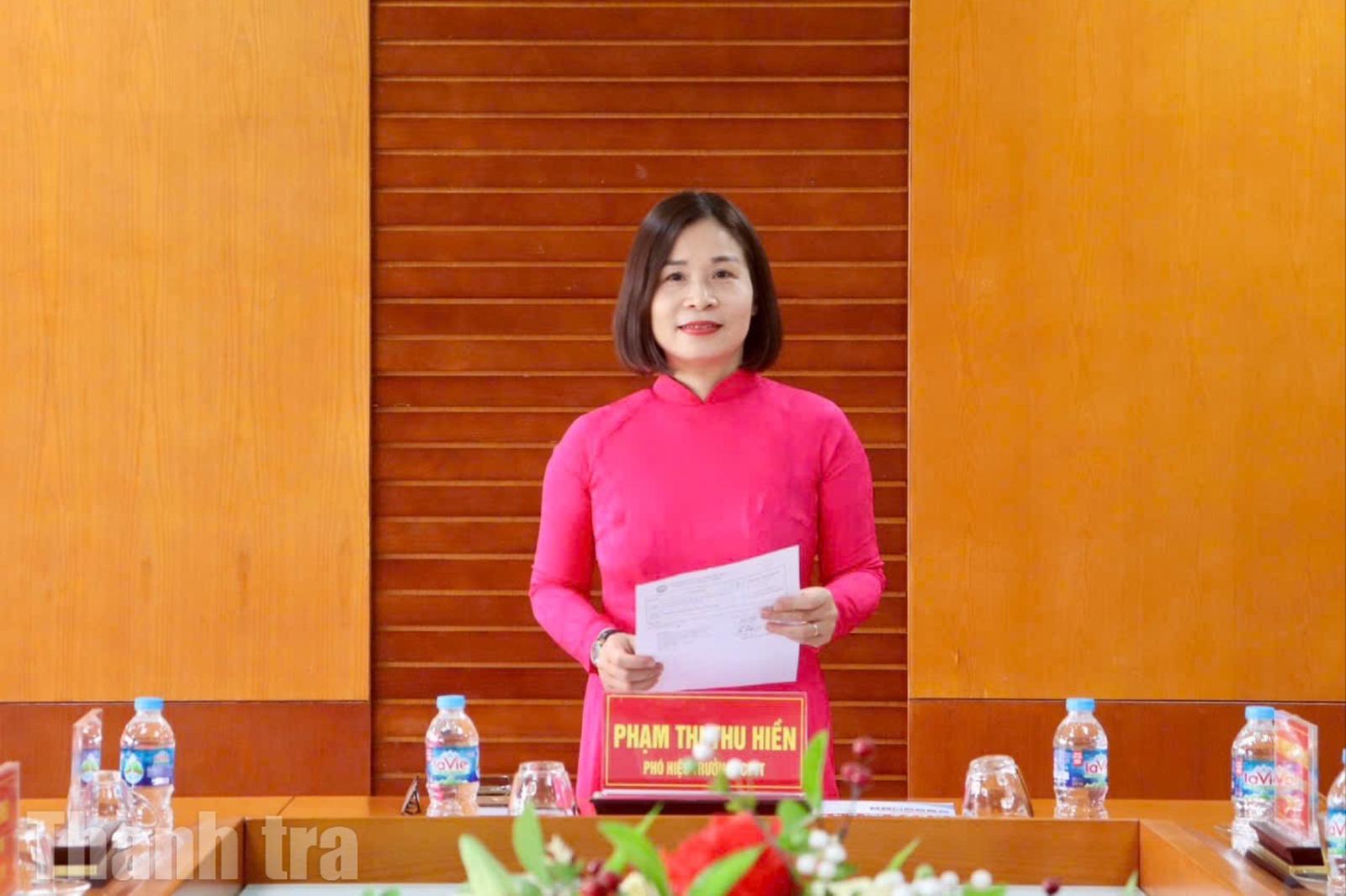 Giới thiệu khái quát cơ cấu tổ chức, chức năng, nhiệm vụ và những kết quả nổi bật của Trường Cán bộ Thanh tra, bà Hiền cho biết, Trường Cán bộ Thanh tra là đơn vị sự nghiệp công lập thuộc Thanh tra Chính phủ, được hình thành trên cơ sở hợp nhất giữa Trường Cán bộ Thanh tra và Viện Chiến lược và Khoa học Thanh tra.