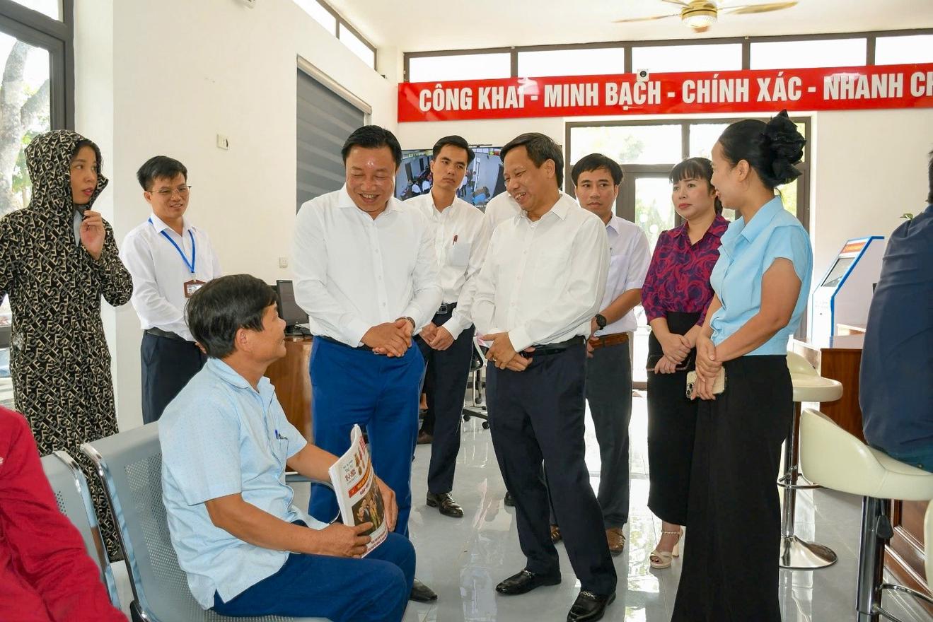 Phó Chủ tịch UBND tỉnh Nguyễn Huy Ngọc (đứng thứ 4 từ phía trái) trao đổi với công dân làm TTHC tại Trung tâm Phục vụ hành chính công xã Lập Thạch trong chuyến kiểm tra mới đây. Ảnh: Phùng Hải