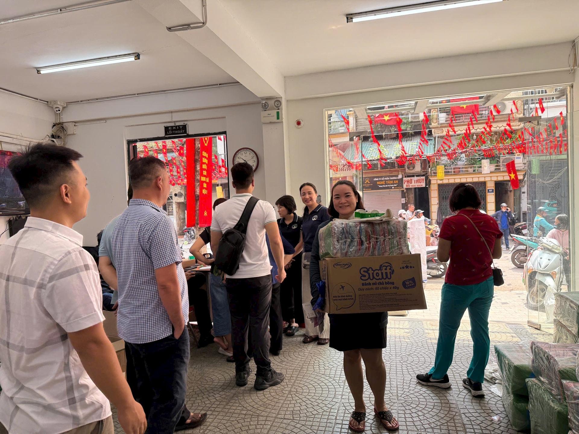 Tình nguyện viên phường Ba Đình hỗ trợ bánh ngọt tiếp sức cho người dân chờ đợi theo dõi tổng hợp luyện diễu binh, diễu hành. Ảnh: TT