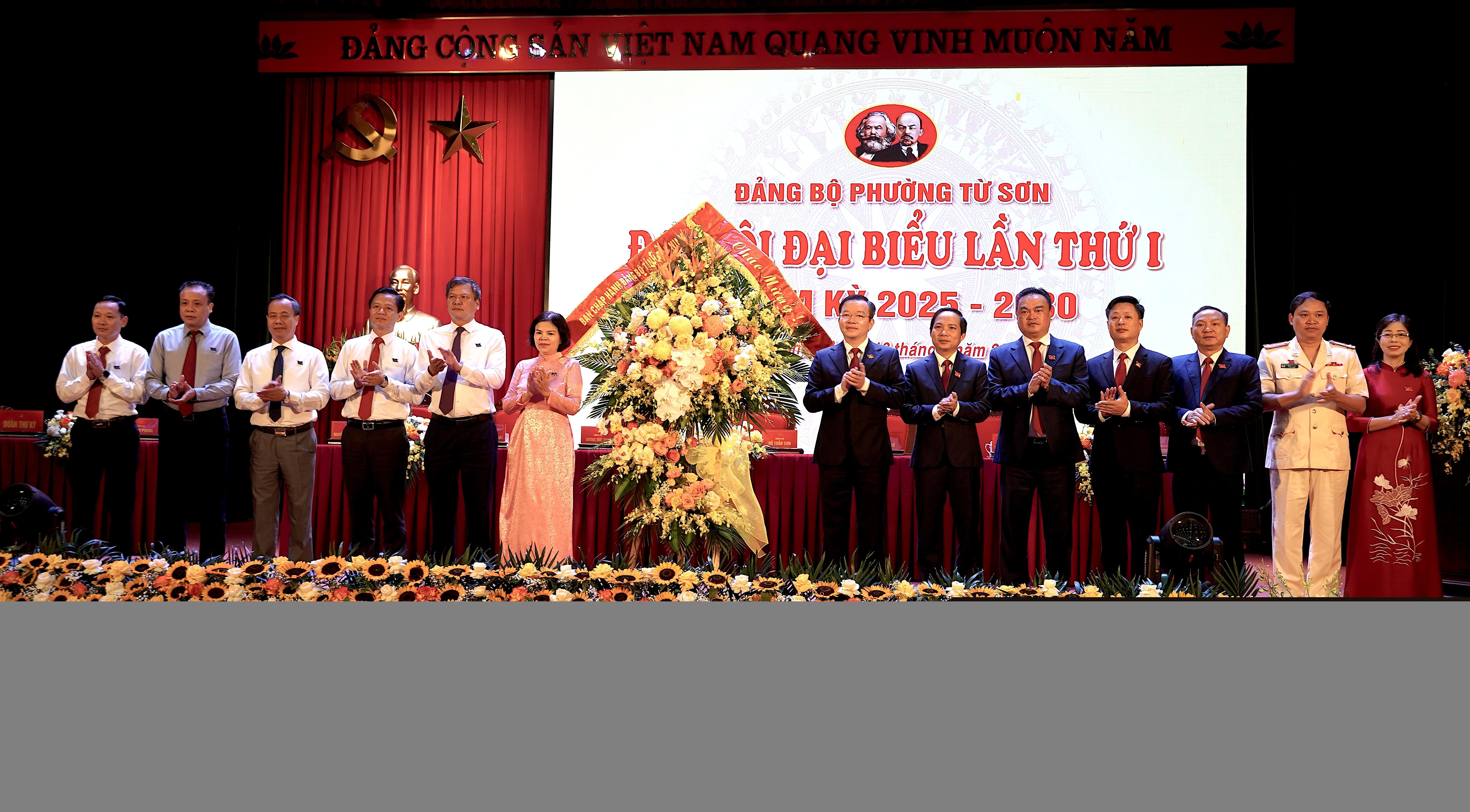 Phó Bí thư Tỉnh uỷ Bắc Ninh Nguyễn Hương Giang cùng lãnh đạo một số sở, ngành tặng hoa chúc mừng Đại hội đại biểu Đảng bộ phường Từ Sơn lần thứ I, nhiệm kỳ 2025 - 2030. Ảnh: Hoàng Long