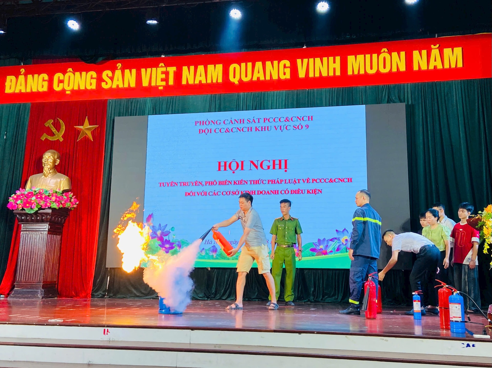 Thực hành sử dụng một số phương tiện chữa cháy tại buổi tuyên truyền. Ảnh: TT