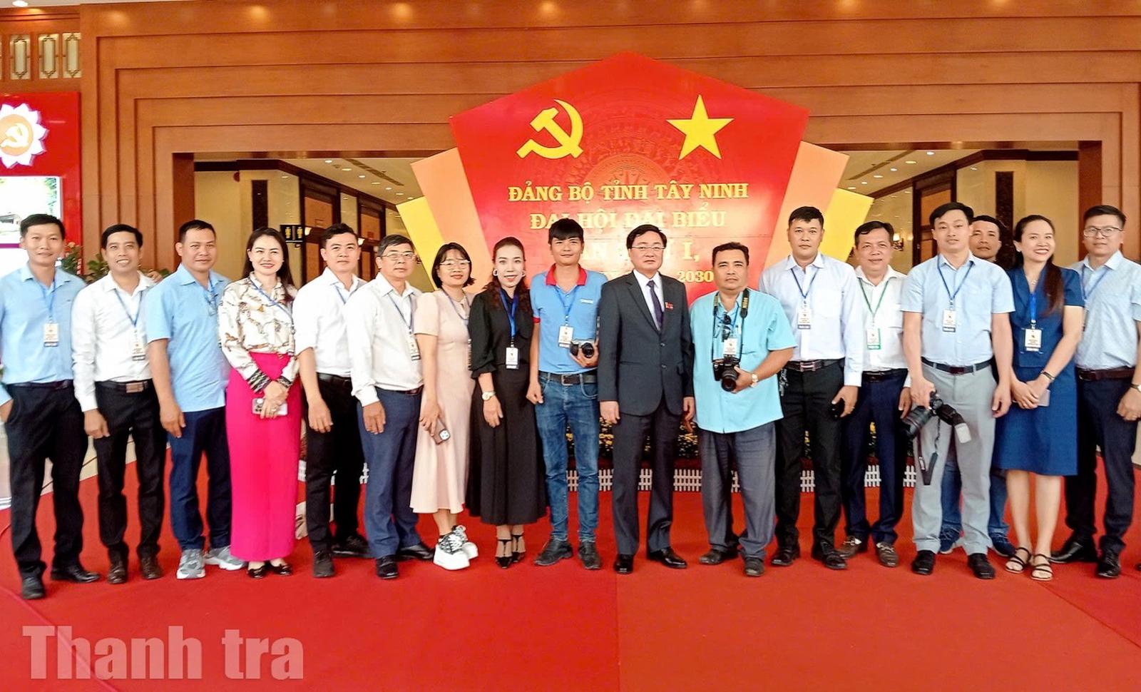 Ông Nguyễn Văn Quyết - Bí thư Tỉnh ủy Tây Ninh chụp ảnh lưu niệm với các phóng viên báo chí tác nghiệp tại Đại hội đại biểu Đảng bộ tỉnh Tây Ninh lần thứ I. Ảnh: Thu Huyền