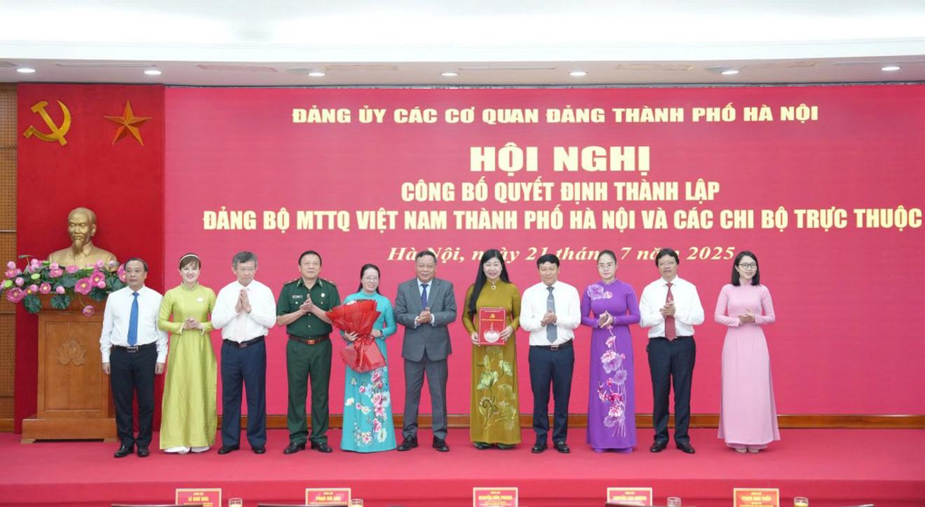 Sáng 21/7, Đảng ủy các cơ quan Đảng TP Hà Nội tổ chức hội nghị công bố quyết định thành lập Đảng bộ Mặt trận Tổ quốc (MTTQ) Việt Nam TP Hà Nội với 36 chi bộ trực thuộc và 679 đảng viên. Đây là dấu mốc quan trọng nhằm nâng cao năng lực lãnh đạo, sức chiến đấu của tổ chức đảng trong hệ thống chính trị của Mặt trận.