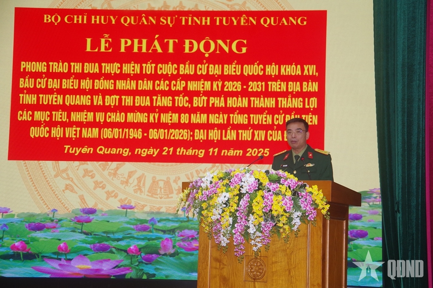 Sáng 21-11, Bộ CHQS tỉnh Tuyên Quang đã phát động phong trào thi đua thực hiện tốt Cuộc bầu cử đại biểu Quốc hội khóa XVI, bầu cử đại biểu HĐND các cấp nhiệm kỳ 2026 - 2031 trên địa bàn tỉnh Tuyên Quang và đợt thi đua tăng tốc, bứt phá hoàn thành thắng lợi các mục tiêu, nhiệm vụ chào mừng kỷ niệm 80 năm Ngày Tổng tuyển cử đầu tiên Quốc hội Việt Nam (6-1-1946 / 6-1-2026) và Đại hội lần thứ XIV của Đảng.