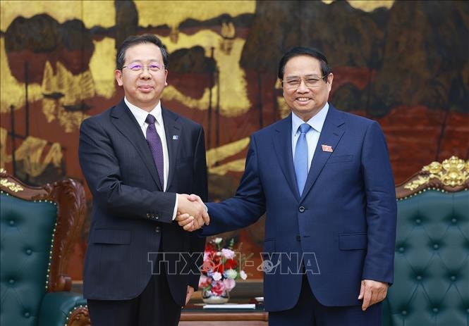 Thủ tướng Phạm Minh Chính tiếp ông Bành Cương Bình, Chủ tịch Hội đồng quản trị Công ty trách nhiệm hữu hạn Tập đoàn Khoa học Kỹ thuật Hoa Điện Trung Quốc (Tập đoàn Hoa Điện Trung Quốc). Ảnh: Dương Giang/TTXVN