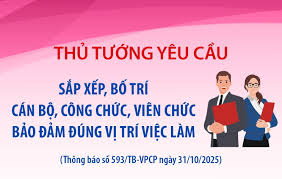 Về vấn đề sắp xếp, bố trí cán bộ, công chức, viên chức bảo đảm đúng vị trí việc làm, Thủ tướng yêu cầu, Bộ Nội vụ chủ trì, phối hợp với các bộ, ngành, địa phương đôn đốc, kiểm tra việc rà soát, sắp xếp, bố trí cán bộ, công chức, viên chức bảo đảm đúng vị trí việc làm, đáp ứng yêu cầu nhiệm vụ; tăng cường biệt phái cán bộ có năng lực, kinh nghiệm về cơ sở./.