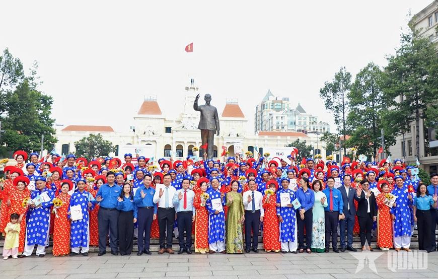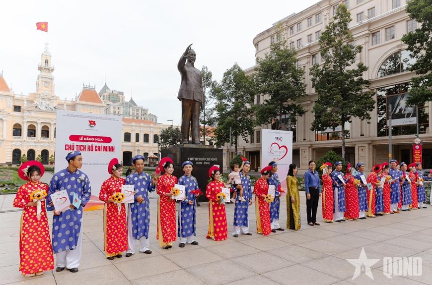 | Lãnh đạo TP Hồ Chí Minh, ban tổ chức cùng 50 cặp đôi tại lễ dâng hoa Chủ tịch Hồ Chí Minh. |
