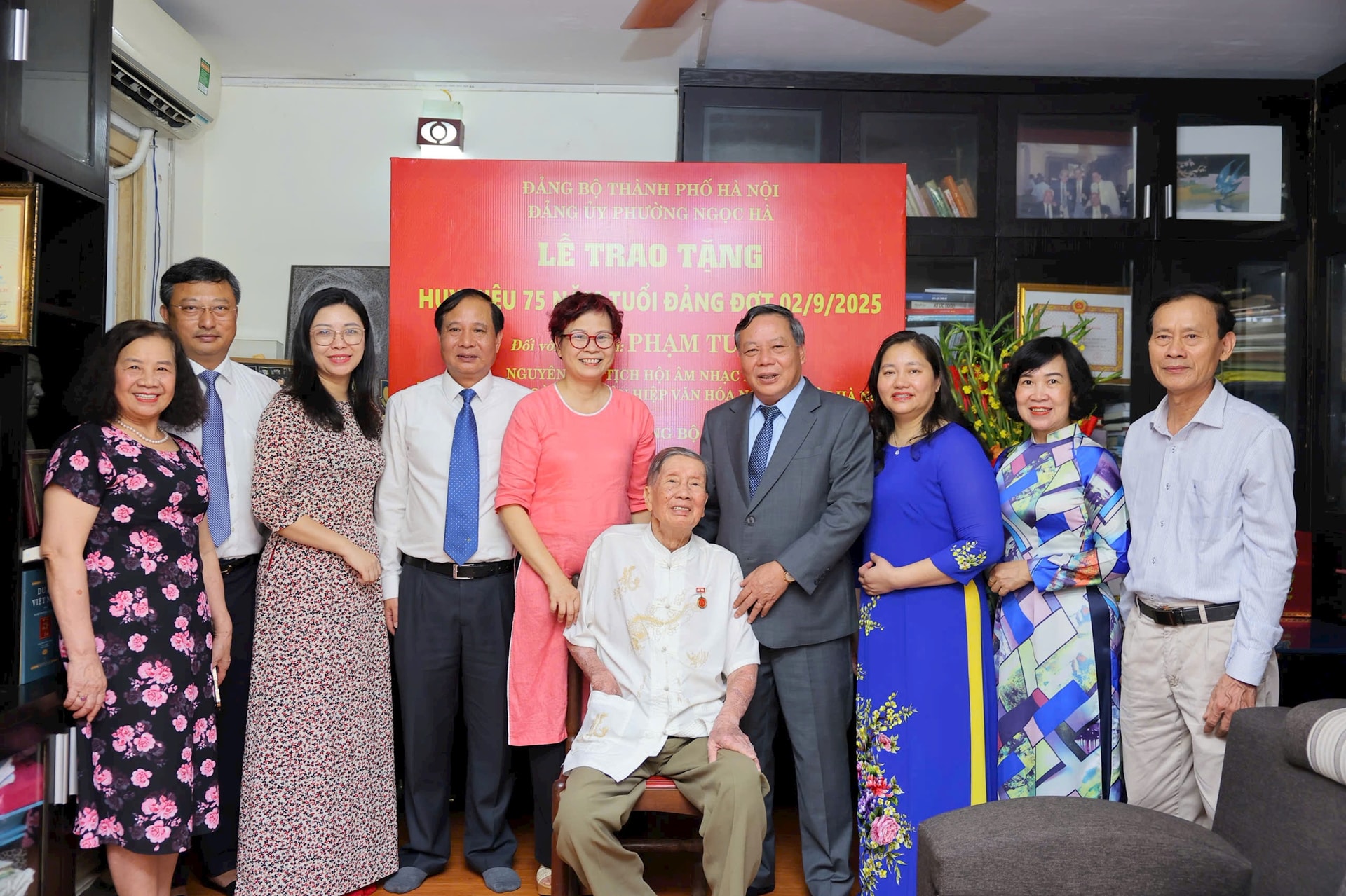 Phó Bí thư Thường trực Thành ủy Hà Nội Nguyễn Văn Phong dự và trao Huy hiệu 75 năm tuổi Đảng tặng nhạc sĩ Phạm Tuyên.