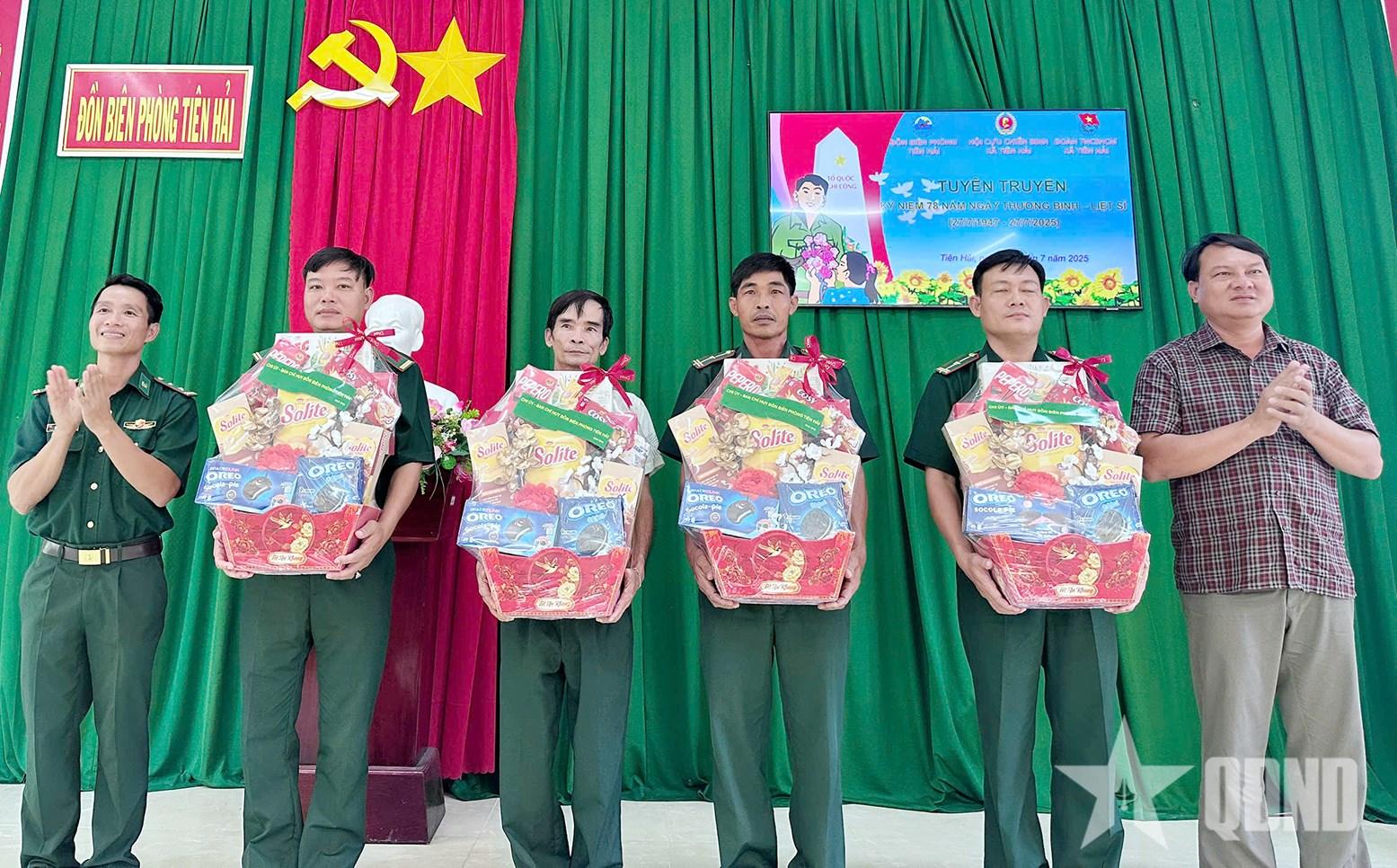 | Đại diện Chỉ huy Đồn Biên phòng Tiên Hải và Thường trực Đảng ủy xã Tiên Hải trao tặng quà cho cán bộ, chiến sĩ là con cháu liệt sĩ, Bà Mẹ Việt Nam anh hùng, thương binh, bệnh binh, có công với cách mạng và 1 thương binh trên địa bàn xã đảo. |