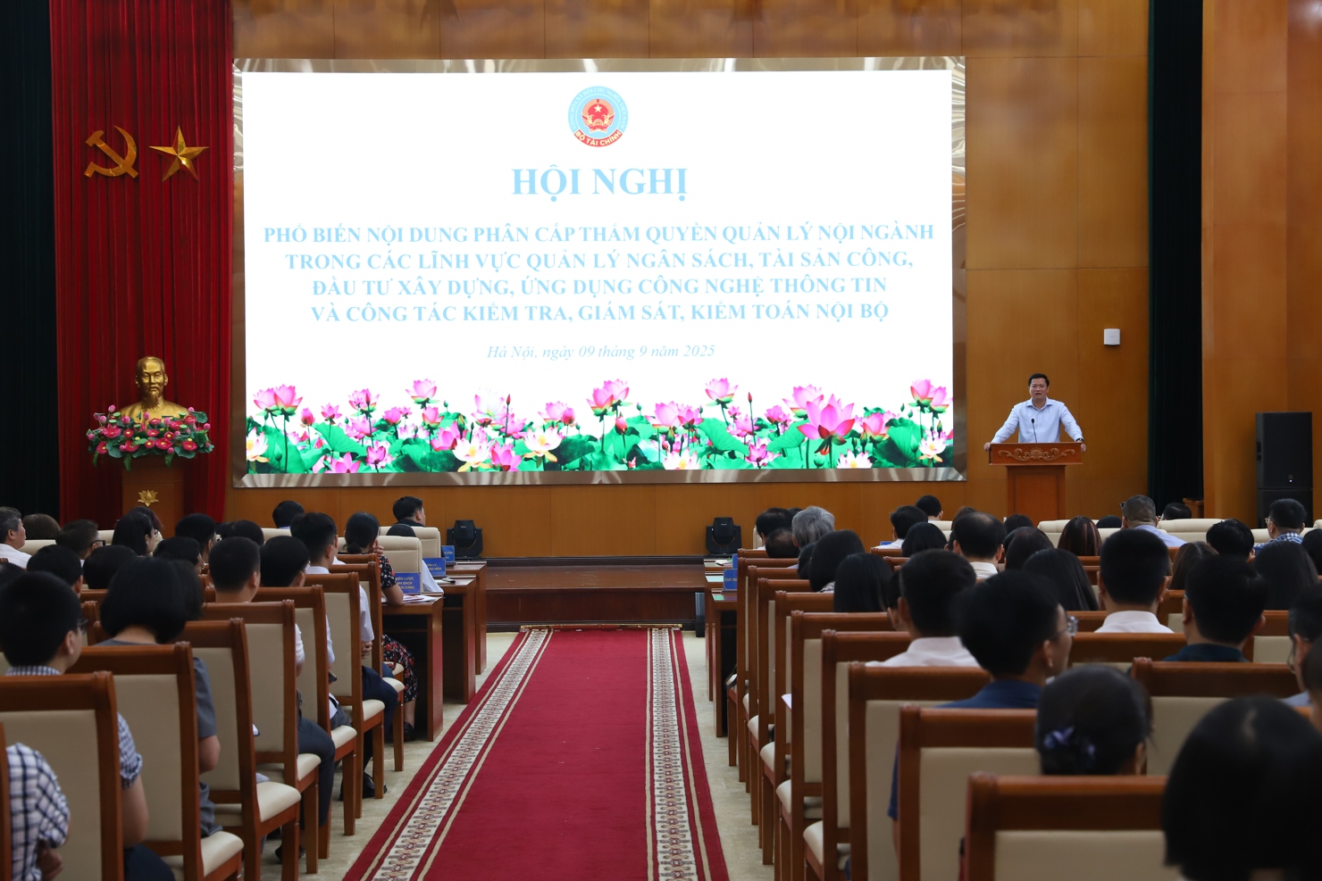 Sáng ngày 9/9, Bộ Tài chính tổ chức Hội nghị Phổ biến nội dung phân cấp thẩm quyền quản lý nội ngành trong các lĩnh vực quản lý ngân sách, tài sản công, đầu tư xây dựng, ứng dụng công nghệ thông tin và công tác kiểm tra, giám sát, kiểm toán nội bộ. Thứ trưởng Bộ Tài chính Nguyễn Đức Tâm dự và chỉ đạo hội nghị.