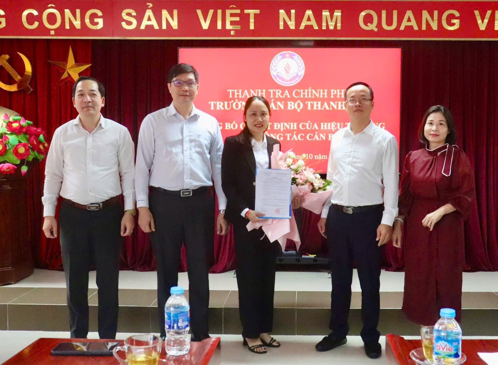 Lãnh đạo Trường Cán bộ Thanh tra trao quyết định bổ nhiệm cho bà Lục Quế Yên. Ảnh: TH