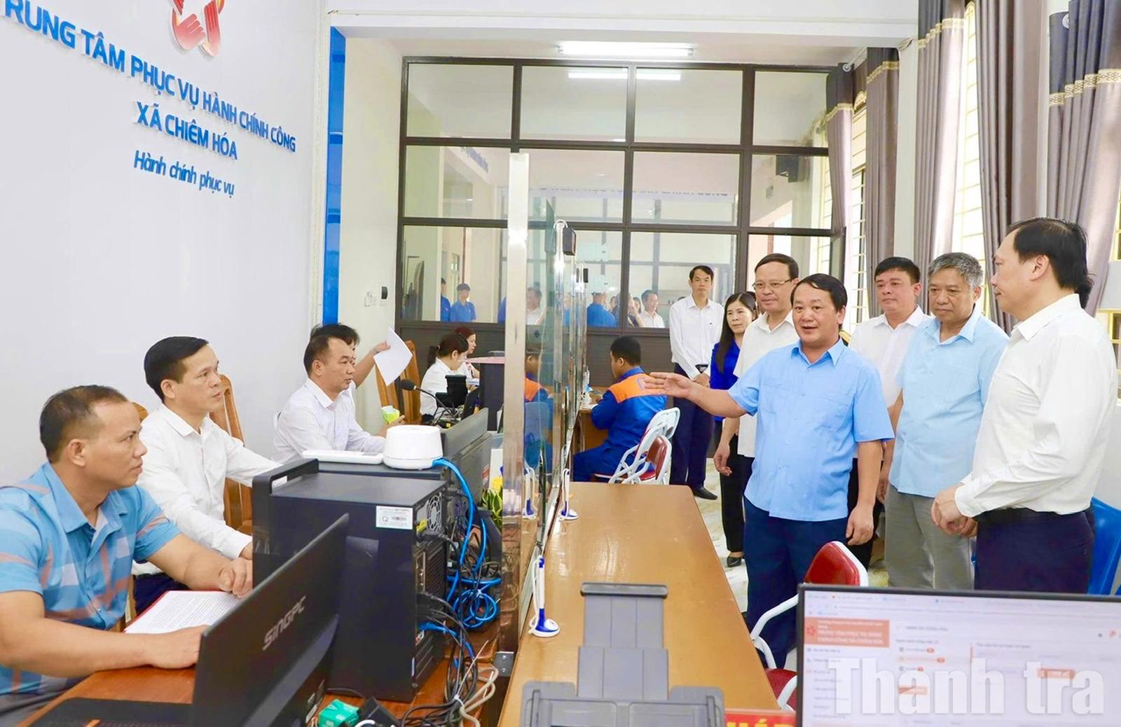 Bí thư Tỉnh ủy Tuyên Quang Hầu A Lềnh kiểm tra, thăm hỏi, động viên cán bộ, nhân viên Trung tâm Phục vụ hành chính công xã Chiêm Hóa. Ảnh: ND