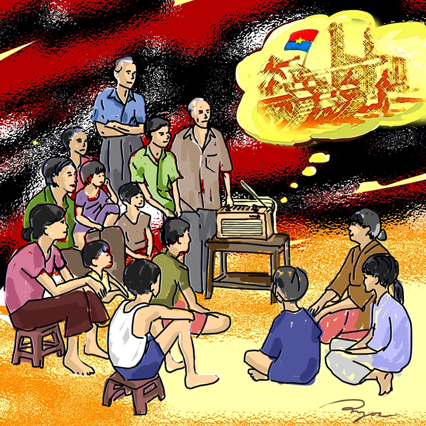 Đó cũng là thời khắc báo hiệu Chiến dịch Hồ Chí Minh lịch sử đã toàn thắng-Giải phóng Sài Gòn, giải phóng Miền Nam thống nhất đất nước. Thông tin nhanh chóng chuyển đi các nhà, mọi người cùng tụ tập tới nhà tôi, xúm quanh chiếc đài bán dẫn. Chiết áp vặn hết cỡ, vậy mà mấy cụ già vẫn hô to: “Vặn đài to nữa lên, nghe cho sướng”. Vui quá, cả xóm tôi như vỡ òa trong niềm vui chiến thắng của đất nước, lũ trẻ hò reo, người lớn cười trong nước mắt. Các cụ, các bác lại dặn bố tôi: Nhớ mượn tờ báo có ngày giải phóng Sài Gòn về đọc cho mọi người nghe.