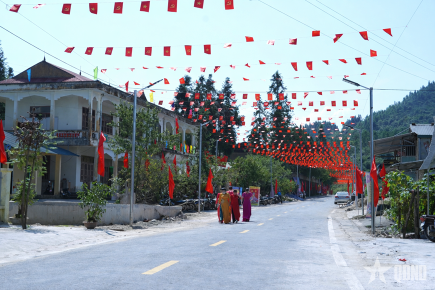 Không khí ngày hội bầu cử lan tỏa trên tuyến đường trung tâm xã biên giới Sơn Vĩ (Tuyên Quang). |