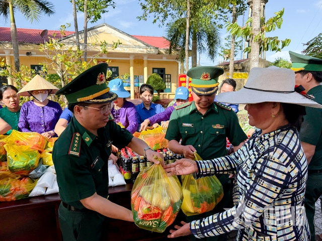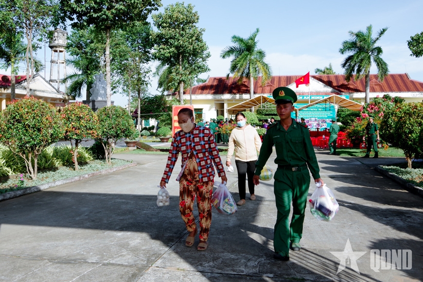 | Các chiến sĩ Đồn Biên phòng Lai Hòa hỗ trợ người dân đến nhận quà. |