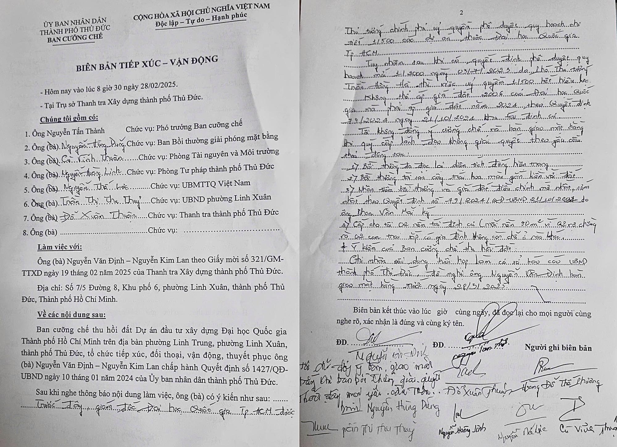 Liên quan đến việc giải phóng mặt bằng, thu hồi đất tại Dự án xây dựng Đại học Quốc gia Thành phố Hồ Chí Minh, ngày 28/2/2025, Ban cưỡng chế thu hồi đất thuộc UBND thành phố Thủ Đức đã có buổi tiếp xúc, vận động đối với ông Nguyễn Văn Định (ngụ tại khu phố 1, phường Linh Xuân).