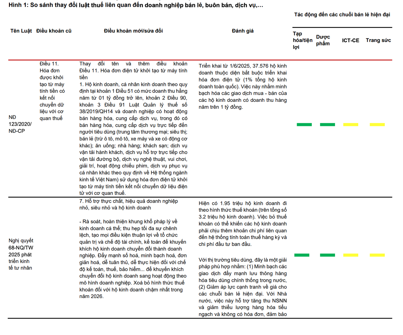 Theo MBS trong báo cáo ngành bán lẻ, việc Chính phủ đưa toàn bộ thị trường bán lẻ – bao gồm cả thương mại điện tử (TMĐT) – vào khuôn khổ quản lý thống nhất sẽ mở ra một sân chơi công bằng, minh bạch. Điều này giúp gia tăng sức cạnh tranh cho các chuỗi bán lẻ hiện đại vốn đã áp dụng quy trình quản lý minh bạch và tuân thủ nghĩa vụ thuế đầy đủ từ trước.
